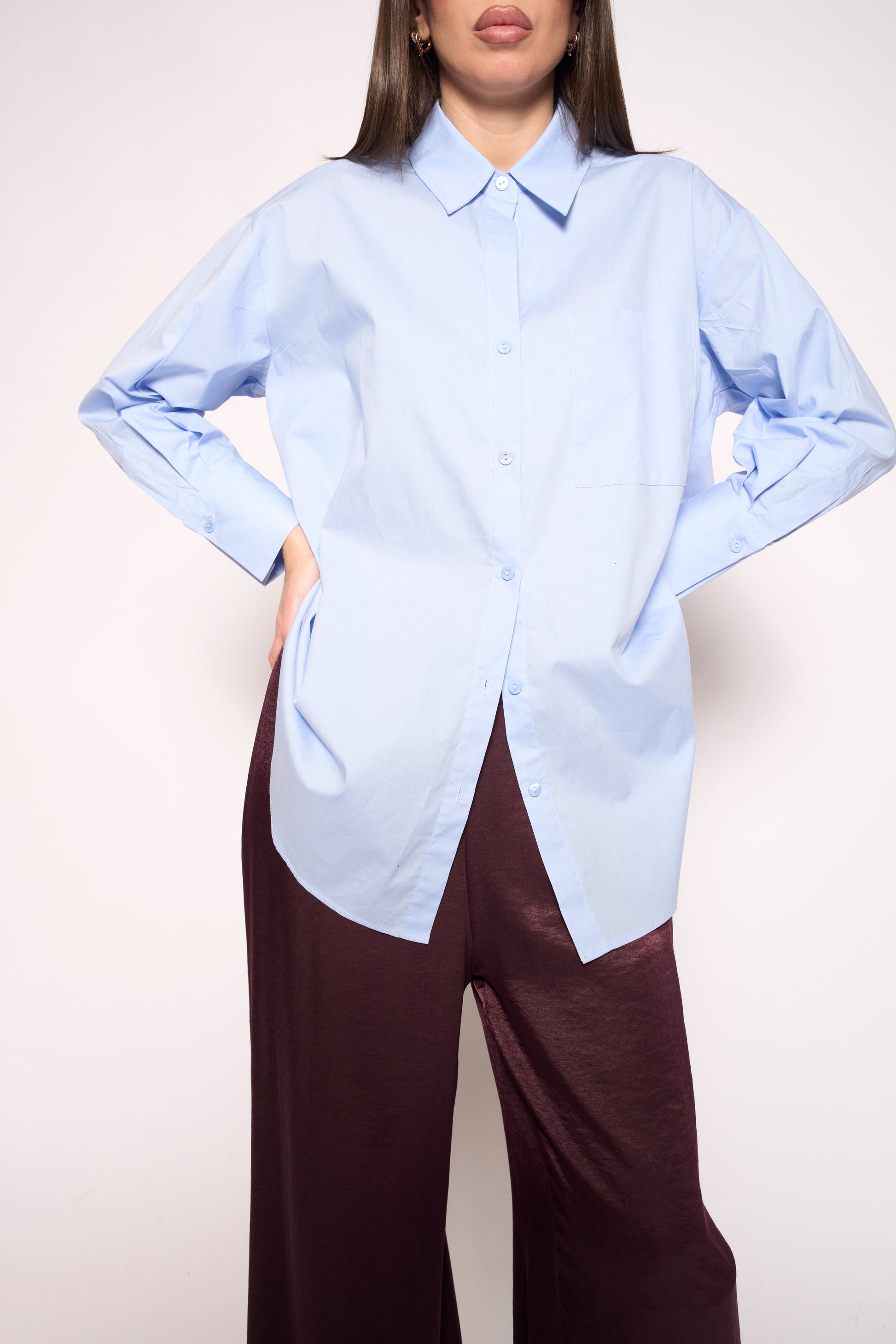 Camicia azzurra basic dal taglio maschile perfetto per chi ama lo stile senza compromessi. Versatile e comoda, si abbina facilmente a jeans, chino o pantaloni formali per un look sempre azzeccato. Realizzata con attenzione ai dettagli, questa camicia è il pezzo must-have del tuo guardaroba. Indossala come preferisci: bottoni aperti su una maglietta, o completamente abbottonata per un'aria più raffinata. Semplicità che non passa mai di moda.
