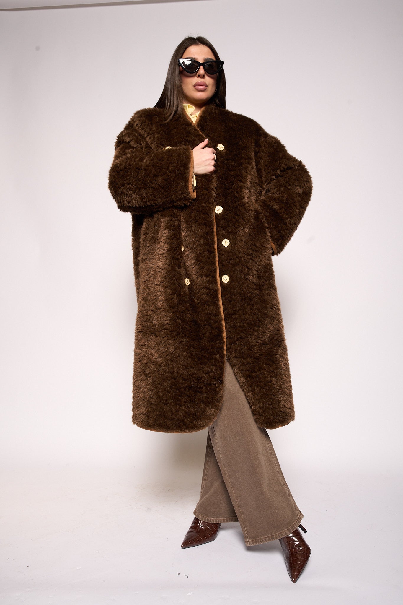 Scopri il nostro Cappotto double face in eco pelliccia, il perfetto equilibrio tra stile e consapevolezza. Con il suo design reversibile, puoi sfoggiare due look completamente diversi in un solo capo. I bottoni eleganti aggiungono un tocco sofisticato, mentre la texture morbida della eco pelliccia ti avvolge in comfort senza compromessi etici. Versatile, chic e pronto a rubare la scena in ogni occasione!