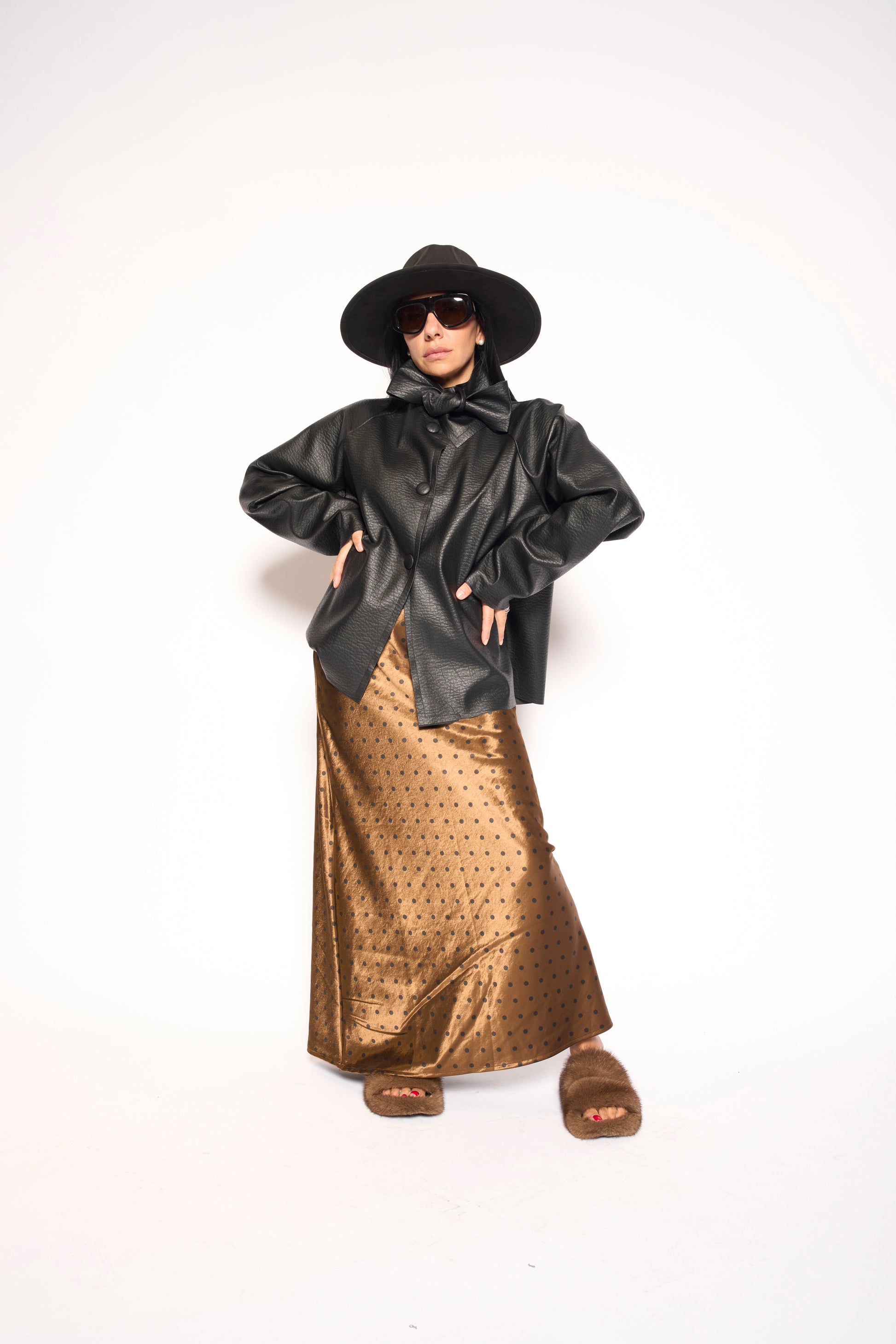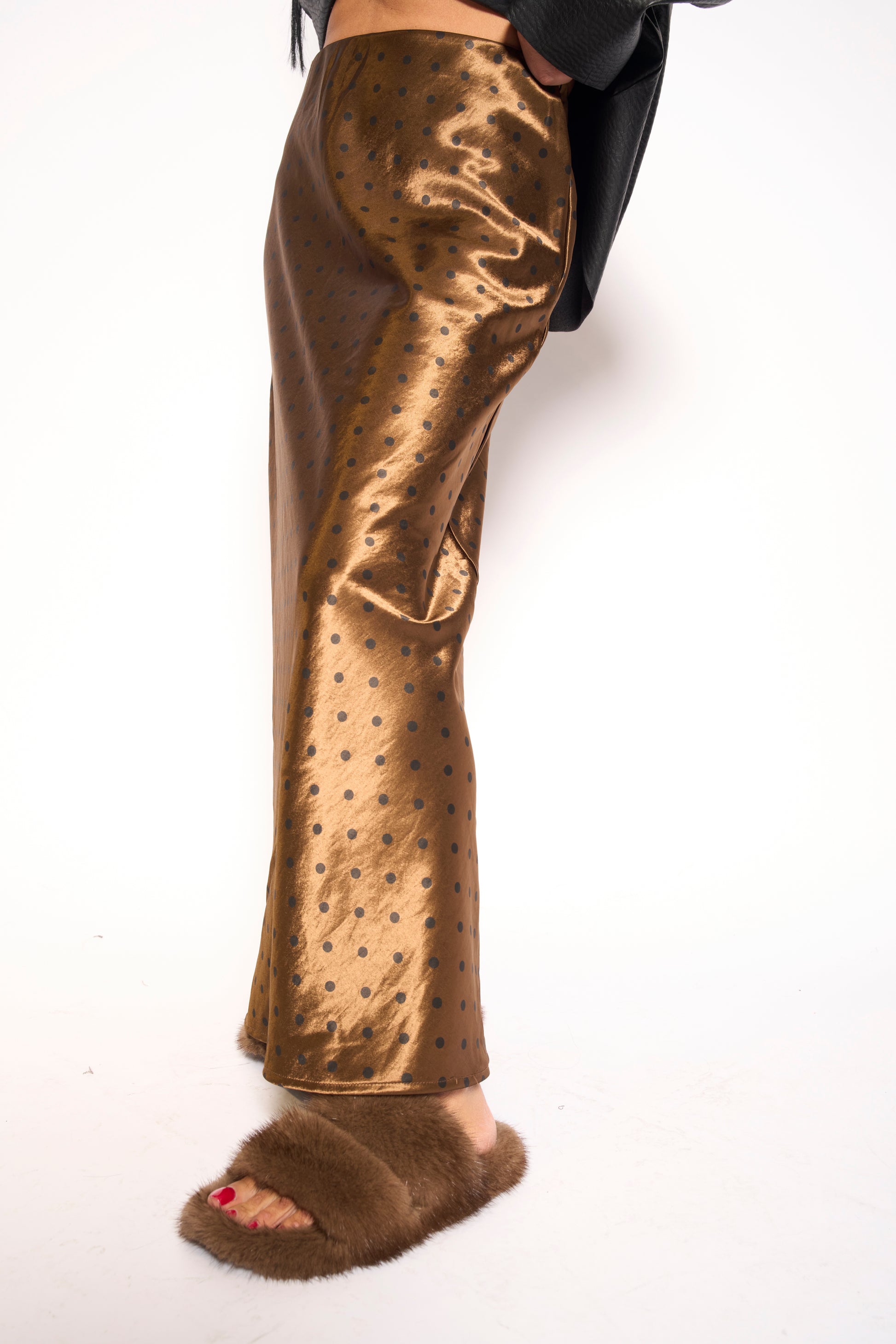 Gonna in raso satinato con un delizioso pattern a pois che gioca tra eleganza e divertimento. Il tessuto morbido e lucido cade perfettamente, creando una silhouette affascinante. Perfetta per chi vuole aggiungere un tocco di leggerezza e stile a qualsiasi occasione, dal casual chic alle serate speciali. Un capo versatile che trasforma ogni look in qualcosa di straordinario.