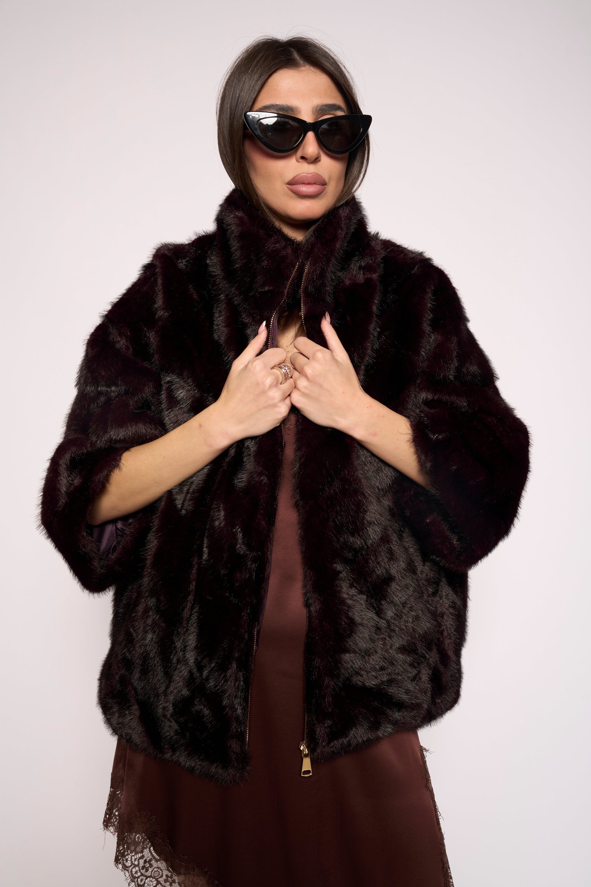 Scopri la pelliccia burgundy in eco pelliccia, perfetta per dare un tocco di colore e stile al tuo guardaroba! Le maniche a 3/4 aggiungono un pizzico di brio e libertà ai tuoi movimenti, ideale per chi vuole essere trendy senza rinunciare al comfort. Calda, cruelty-free e irresistibilmente morbida, questa pelliccia è un abbraccio chic per ogni occasione!