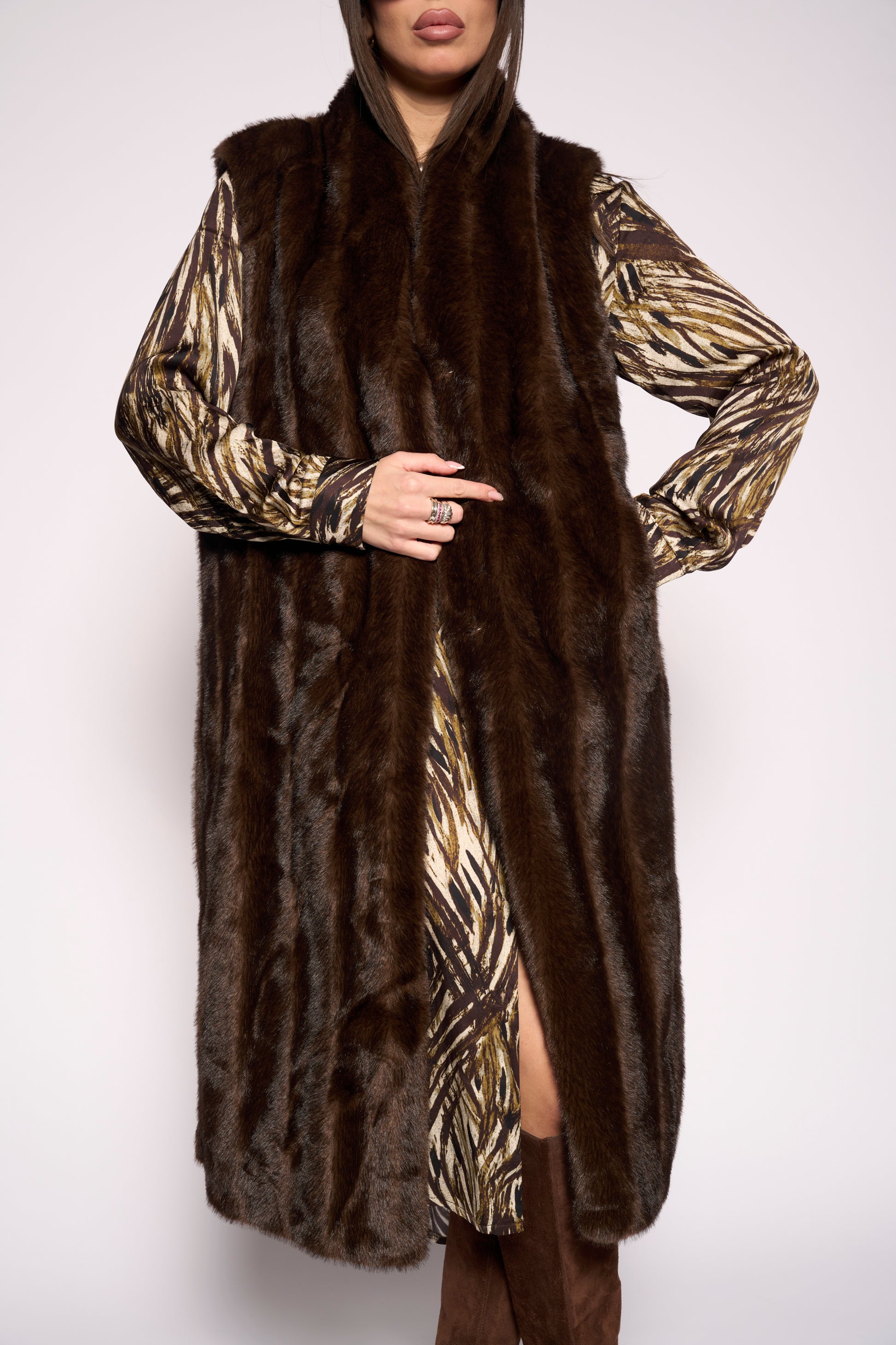 Questa pelliccia lunga smanicata in eco visone unisce stile e sostenibilità con un tocco di divertimento. Morbida e avvolgente, ti permette di giocare con i look senza rinunciare alla comodità e al calore. Perfetta per chi ama distinguersi con un pizzico di allegria anche nelle giornate più fredde!